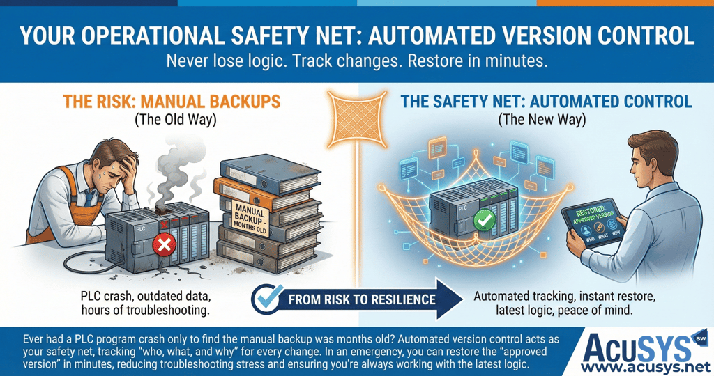 Relying on manual backups is a gamble. In a busy production environment, it is nearly impossible for a team to perfectly document every small logic adjustment.