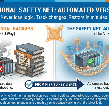 As industrial environments become increasingly complex—managing a growing number of PLCs, robots, and SCADA systems—the risk of unplanned downtime due to human error, undocumented changes, or hardware failure skyrockets. Preparing for an AI-integrated future isn't just about adding intelligence; it's about building an Operational Safety Net that ensures your basic logic is always secure, tracked, and recoverable.