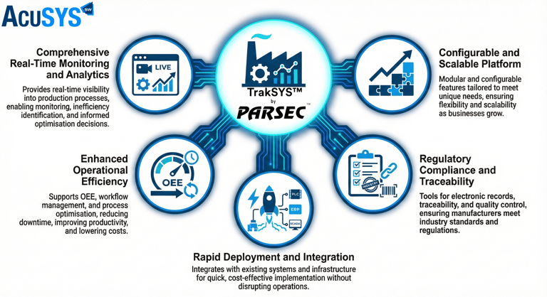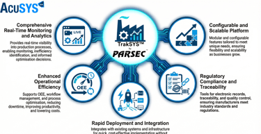 TrakSYS, developed by Parsec, is a comprehensive Manufacturing Execution System (MES) software platform designed to optimise manufacturing processes. By offering tools for real-time monitoring, analysis, and production management, TrakSYS empowers businesses to enhance efficiency, reduce costs, and drive productivity through data-driven decision-making.